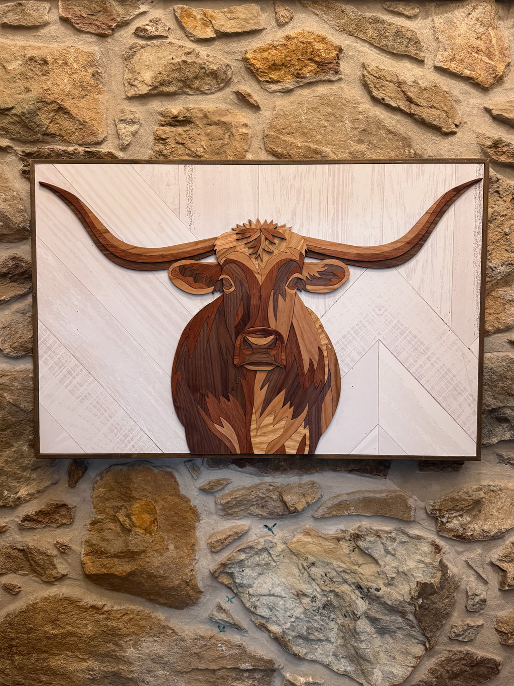 This piece is made up of six wood species, including mahogany, walnut, cherry, maple, red oak and white oak. There are 91 cut pieces that have been hand sanded, cleaned and oiled to bring out the woods natural beauty. Each piece is then carefully hand placed to create beautiful artwork through segmentation.
